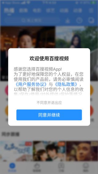 1、打开下载好的百搜视频app,点击同意用户服务协议与隐私政策。