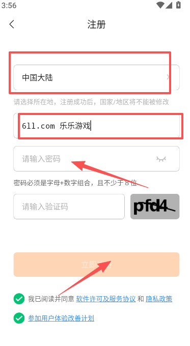 2、设置用户注册所在地,输入个人邮箱并设置登录密码,输入图形验证码以后点立即注册。