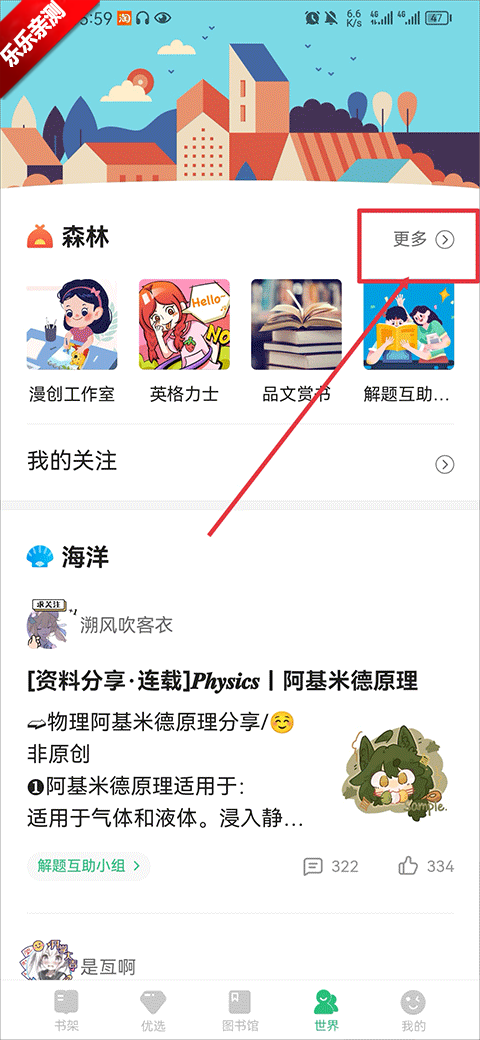 1、打开app,在世界界面中点击森林版块右边的更多