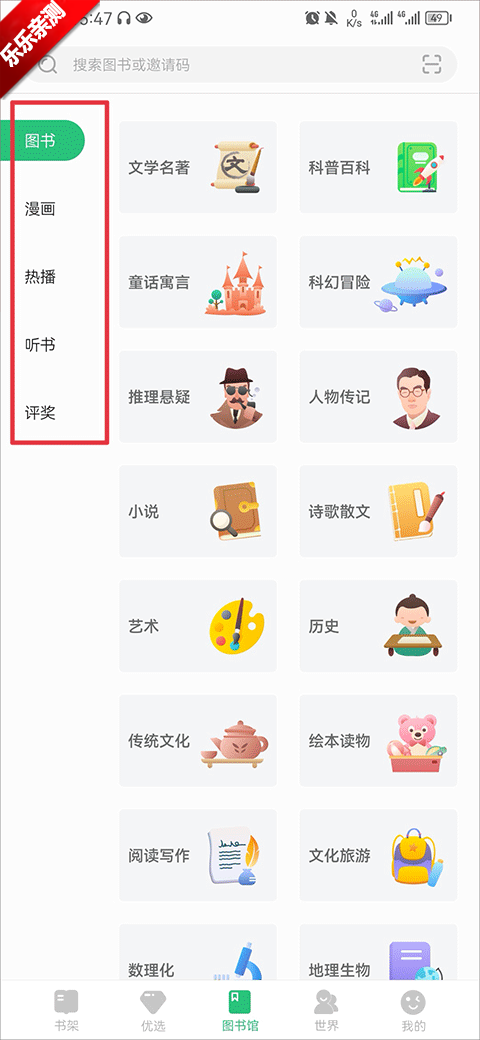 1、打开app后,在图书馆中选择你喜欢的书籍分类
