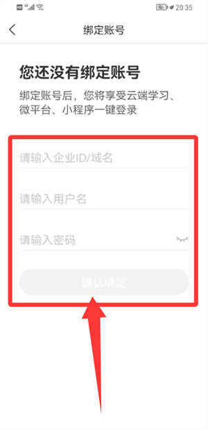 3、在账号绑定页面输入企业信息及用户名密码,点击确认完成绑定。