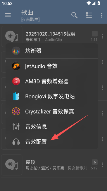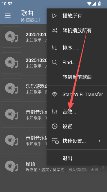 3、点击歌曲列表栏,并点击页面右上方的三点选项,找到音效功能。
