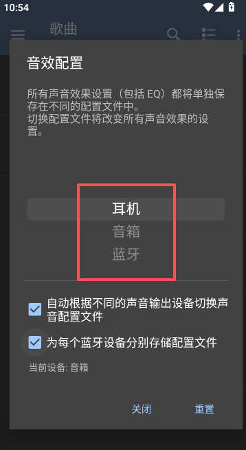 5、更改音效配置内的设备连接方式,将原有的耳机播放方式改为音箱或是蓝牙,寻求最佳的音效解决方案。