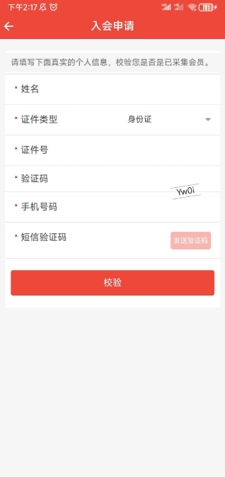 2、填写入会申请个人信息,姓名、证件号、验证码、手机号码、短信验证码后,点击【校验】,跳转至【入会申请】页面;