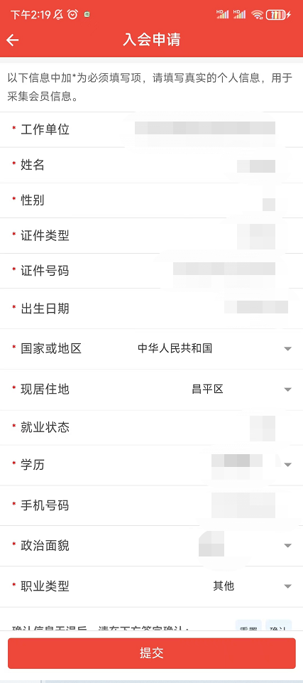 3、填写【现居住地】、【学历】和【职业类型】后,点击【提交】,等待工作人员审核;