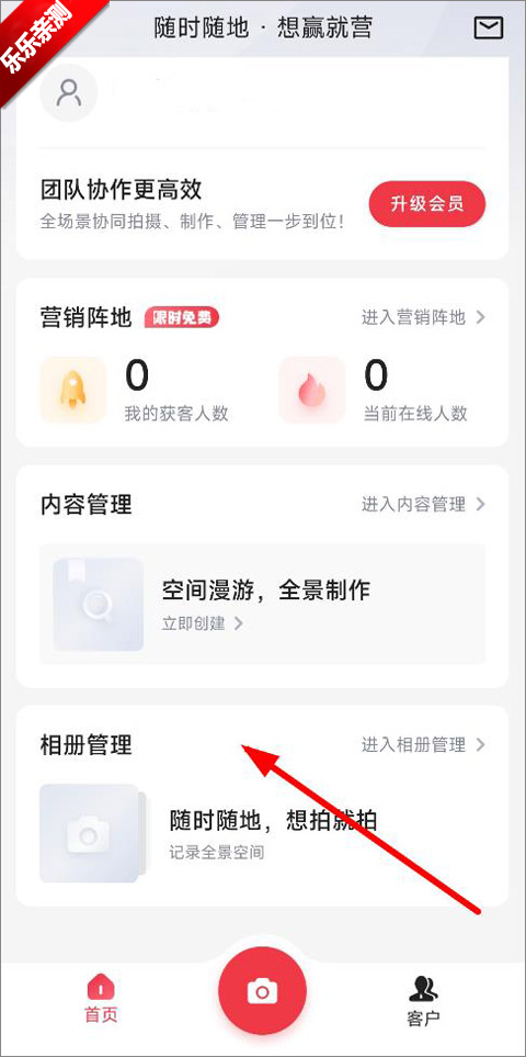 1、打开小红屋全景相机app,进入首页,首页可以查看营销阵地、内容管理和相册管理,点击相册管理;
