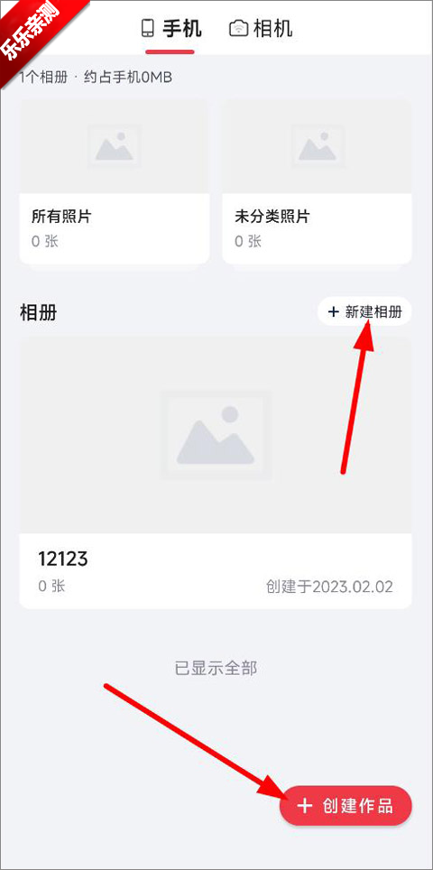2、相册管理页面有在小红屋里拍摄的照片,会储存相册里,点击相册或者创建作品,选择照片;