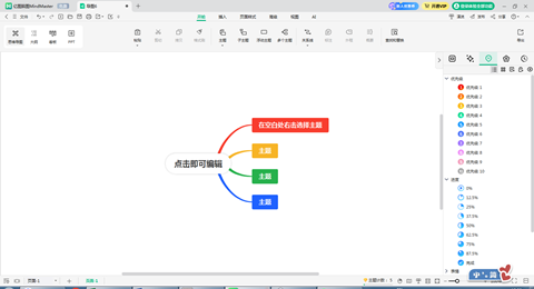 在空白舞台中心会显示【中心主题】选项,我们双击可修改其内容和样式,右击选择【主题】即可为其增加分支主题。