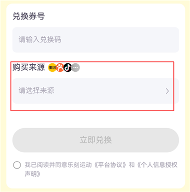 2、在购买来源是美团、大众等App的框中,输入美团的卷码,点击【立即兑换】即可。