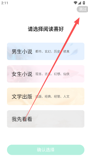 1、进入软件以后,点击选择你的阅读喜好,如果看的比较全建议直接跳过该部分。