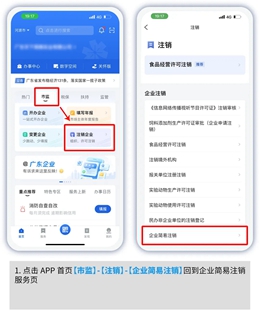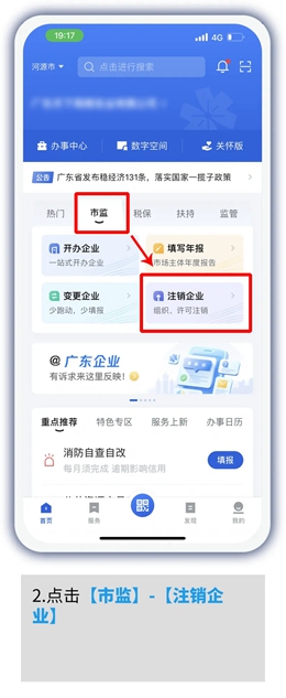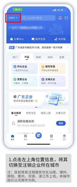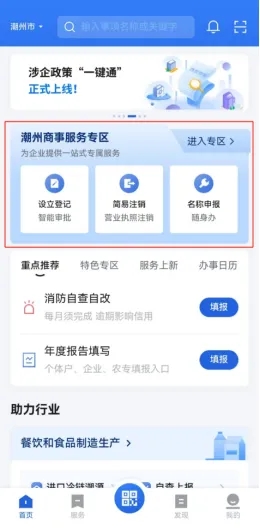 1、打开“粤商通”APP,确认当前选择地市为将要开办企业的所在地,如:xx市,点击【市监】→【开办企业】或通过【潮州商事服务专区】进入服务并刷脸登录。