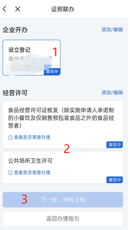 5、点击【设立登记】,按照页面提示,填写设立登记的各项信息,完成后再点击对应的【经营许可】填写各项信息,置灰的选项由系统带入,不可修改。所有信息填写完成后再核对各项信息,完成后点击【下一步】进行材料上传,自主选择领取方式并提交申请。