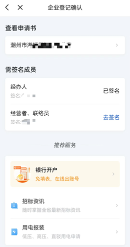 7、营业执照设立核准通过后,需完成许可文书签名。在粤商通企业登记确认模块选择需要签名的业务。查看业务申请书,确定无误后点击【去签名】。注:点击去签名需保证微信是启动的。