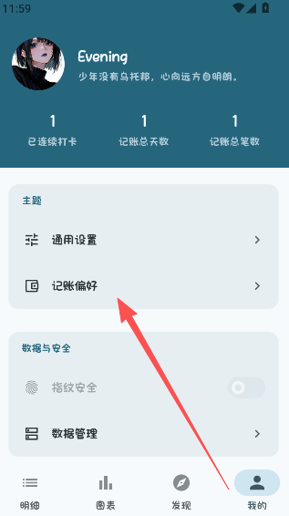 1、进入我的页面,点击记账偏好选项。