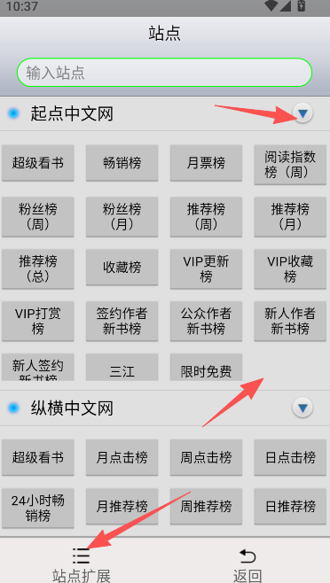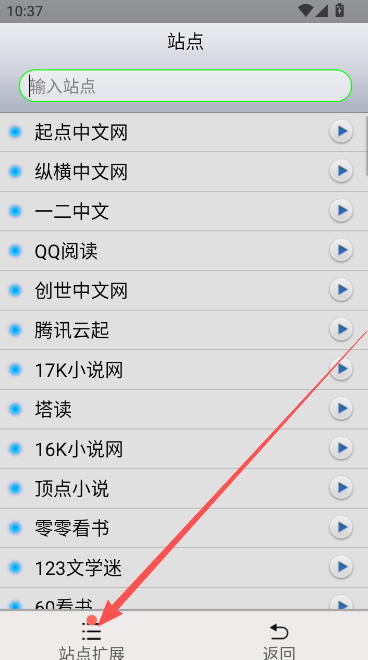 3、点击站点列表内可添加的书源,选择站点扩展。
