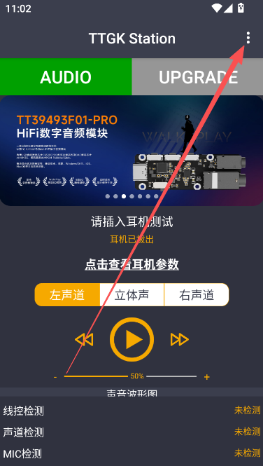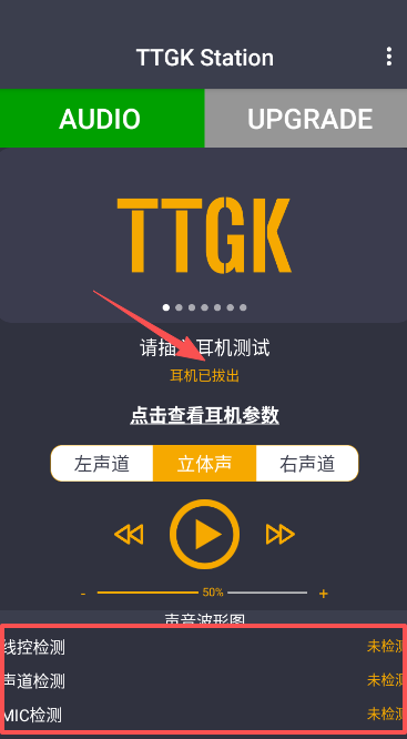 1、下载乐乐游戏TTGK Station安装包启动软件进入,插入目前所使用的耳机开始测试,检测指标主要有:线控检测、声道检测以及MIC检测。
