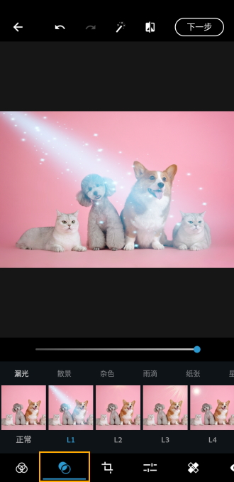10、点击效果图标,就可以给图片添加一下氛围,如漏光、杂色等效果,也可应用创意纹理和叠加效果,让简单的图像瞬间变得灵动而独具特色;