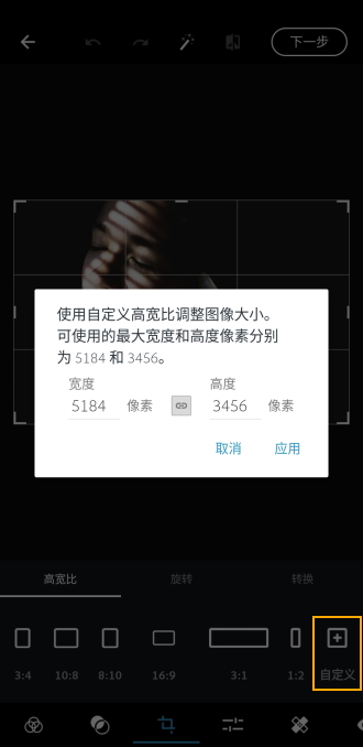 若要在Android系统中调整照片的大小,选择“裁切”工具 > “可调大小” > “自定义”。
