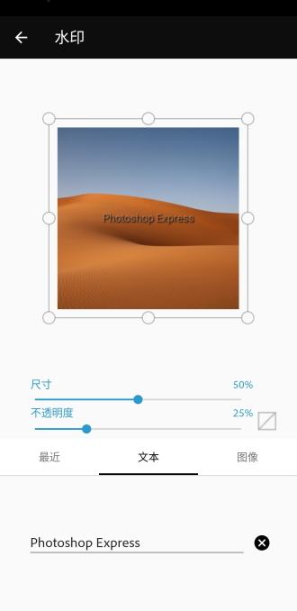 您可以在Photoshop Express中将所需的图像或文本作为水印添加到照片。若要添加水印:
