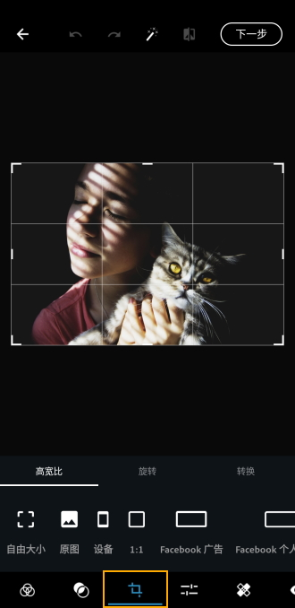 9、点击第4个剪裁图标,用户可以裁切、修齐、旋转和翻转照片。此功能帮助用户按照任何社交媒体平台的要求,选择照片的宽高比或自定义照片大小;