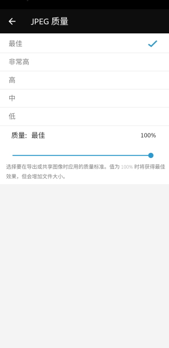 您可以选择在导出或共享图像时应用到照片中的质量标准。值为100%时将获得最佳效果,但会增加文件大小。默认情况下,质量比例设置为 85%。