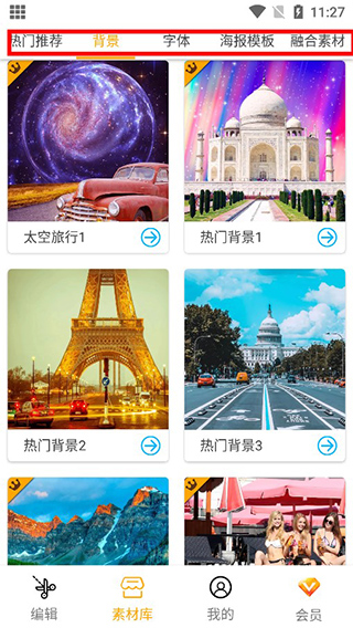 3、在素材库界面拥有背景、字体、海报、推荐等素材可以使用,方便用户创作出精美的图片;