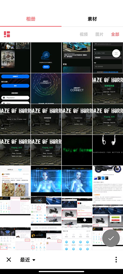在主界面点击「视频」,即可找到本地视频内容。在这里点击所需要内容后,再一次点击「剪刀」图标,即可进行第一次的粗剪。剪辑完后,点击右下角的「打钩」符号,表示完成。
