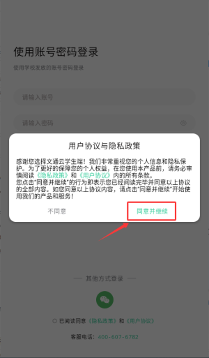 1、启动文通云学生端应用,在协议政策页面点击同意并继续进入。