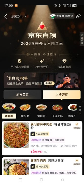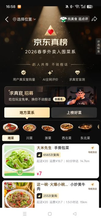 2、京东外卖京东真榜发布2026春季外卖入围菜品,以地方菜系和上榜好菜为标准推送。