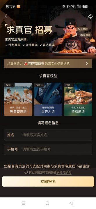 5、如果想要成为京东真榜的求真官,可参与京东真榜计划招募求真招聘,上传各项认证资料,完成招募,等待官方联系你确认。