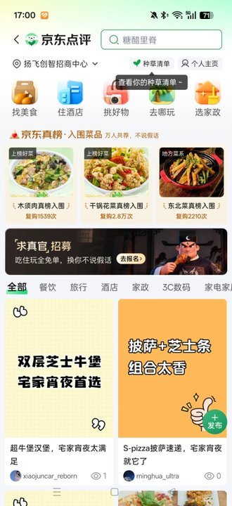 1、京东外卖京东点评排行榜功能上线,在京东真榜页面点击右上方的找美食,逛点评可以参与。