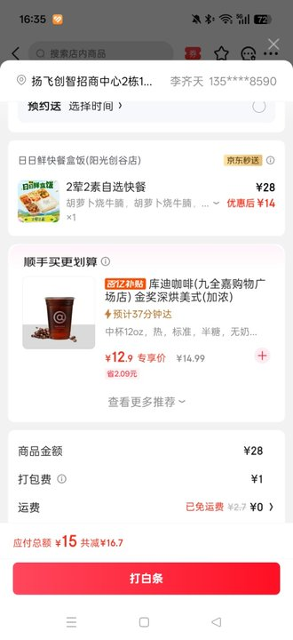 5、完成以后加入购物车,跳转至外卖订单支付界面,使用账户余额、京东豆或是白条的方式完成支付。