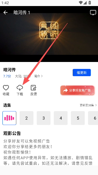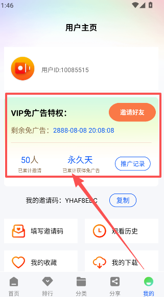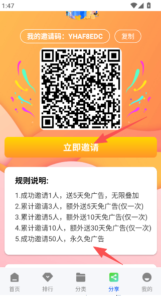 2、如果有遇到中间弹出广告的情况,可在分享页面中以推广二维码的方式获得免广告观看权限。