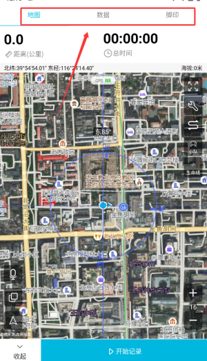 3、进入行程记录功能,可实时查看运动轨迹、统计行进数据并开启定位足迹记录。