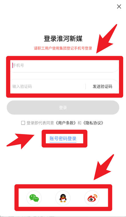 1、登录界面支持手机号快捷登录,只需输入手机号并获取验证码即可快速进入平台,也可以选择账号密码方式或微信、QQ、微博三方登录。