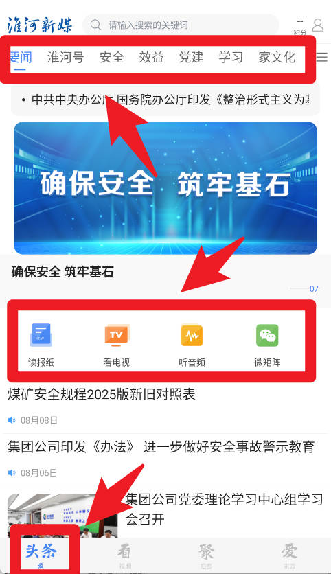 2、首页导航栏涵盖新闻、淮河号、安全等多个栏目,页面中部提供读报纸、看电视、听音频等功能入口,让用户选择不同方式了解信息。