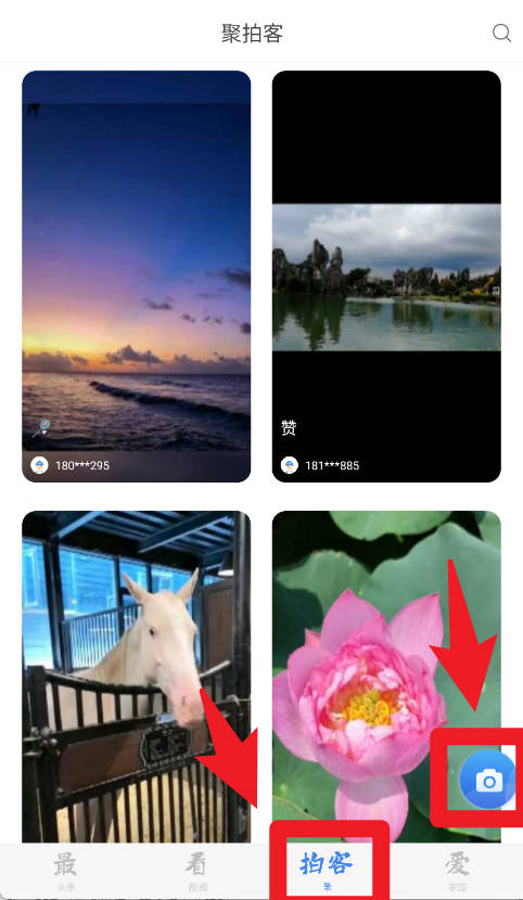 5、拍客版块允许用户上传自己的照片作品,点击拍摄按钮即可发布,其他用户还能浏览与点赞,实现互动与分享。