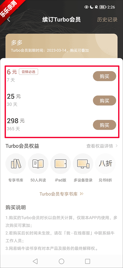 2、在续订Turbo会员界面选择好开通会员的时长然后点击购买选项;