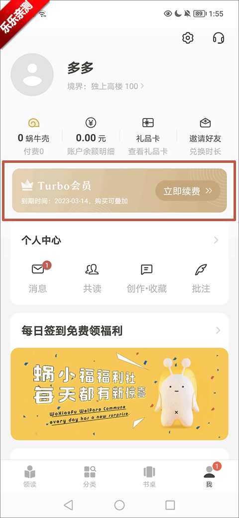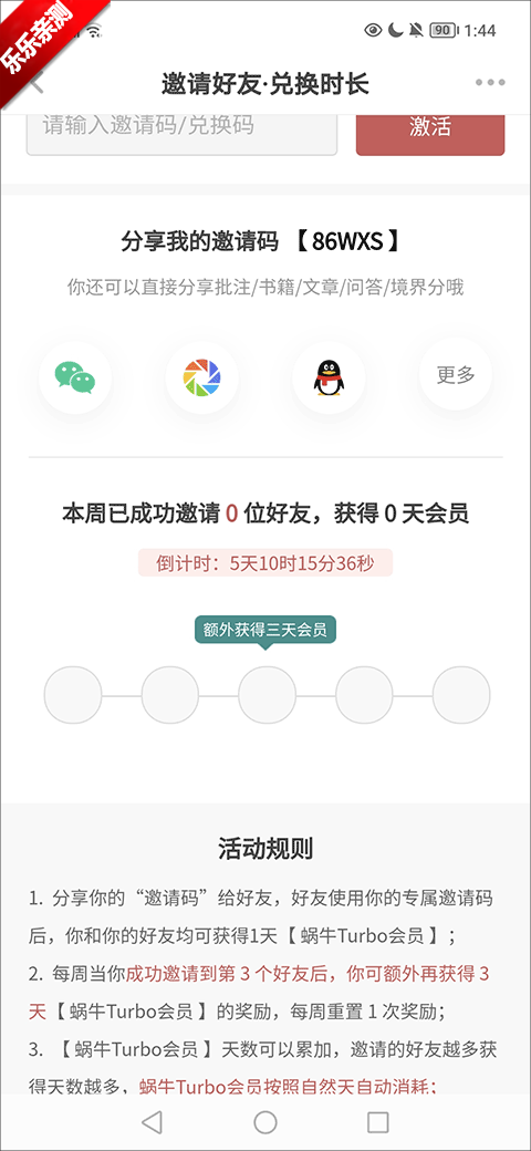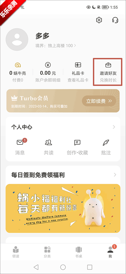 而要是不想花钱的话,其实也有方法可以获得阅读时长那就是邀请好友。通过个人中心邀请好友的功能分享邀请码,每邀请到1个用户就可以获得1天的会员,也就能够解锁的相应的阅读时长哦!