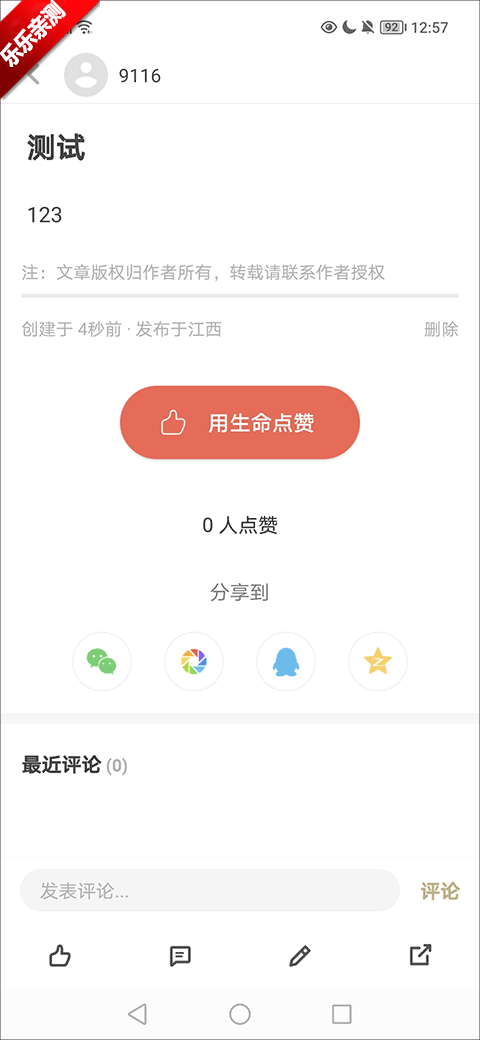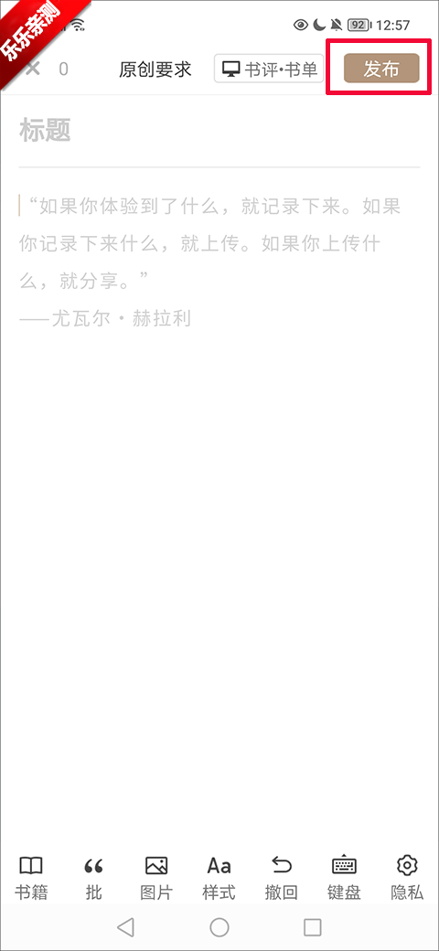 2、在书评界面,输入标题和内容后,点击右上角的发布按钮即可发布自己的稿件;