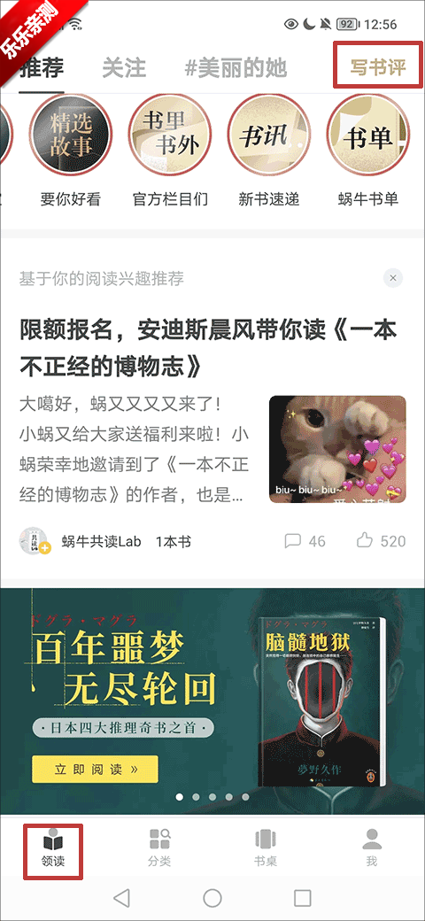 1、首先,打开应用,在领读界面找到并点击右上角的“写书评”选项;