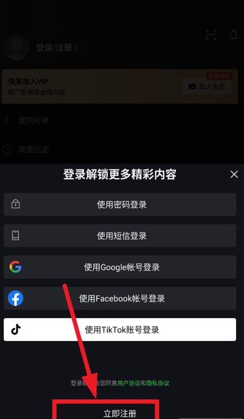 3、选择用户登录方式,通过密码、手机短信、谷歌账号或是facebook、tiktok等社交平台登录,如果没有的话建议直接选择最下方的立即注册。