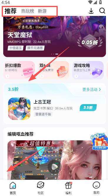 1、一元手游添加游戏操作,主要是为了方便在线云玩,玩家们可点击上方推荐、热玩榜单或是新游添加,也可以直接点击首页其他类游戏封面。