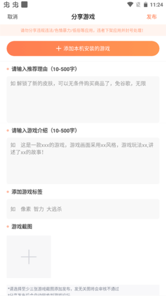 3、然后就填写要发布的游戏信息,即可分享。