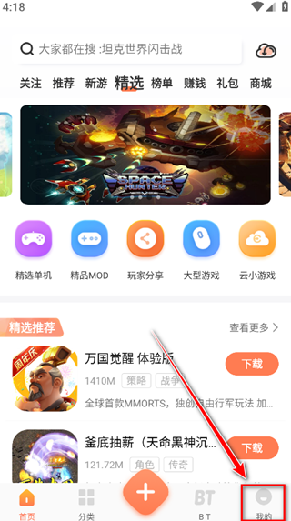 1、下载完本网站软件以后点击进入内容,可以看到上方的有精选单机、精品MOD、玩家分享、大型云游和云小游戏几个条目,其中“精品mod”和“玩家分享”都能为你带来破解游戏。