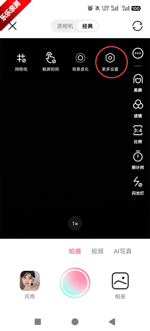2、打开轻颜相机后,在拍照界面中点击左上角的【更多】按钮;
