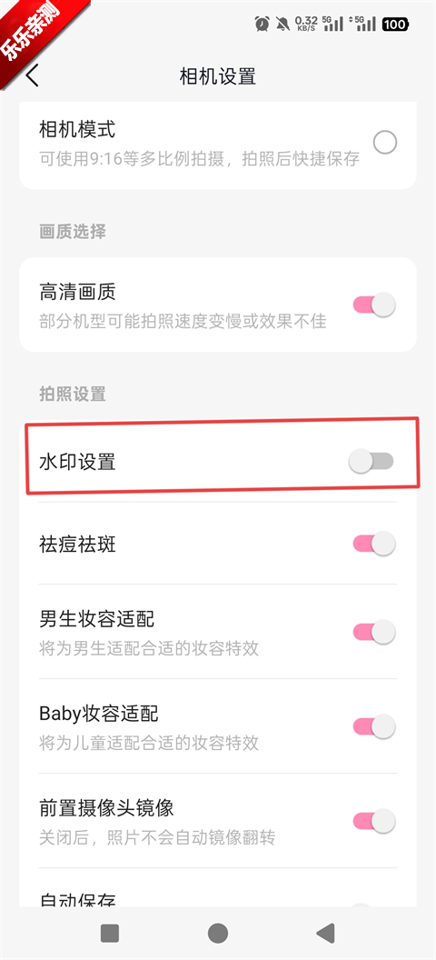 3、找到水印设置,关闭即可。祛痘祛斑、男生妆容适配等功能都是在这里关闭的。