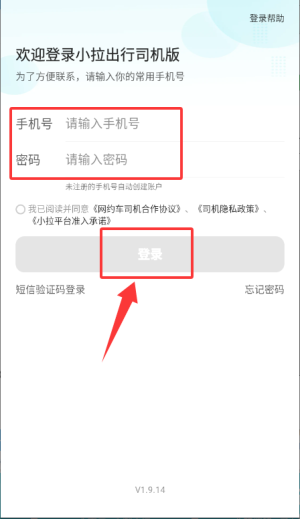 1、下载安装小拉出行司机版app,打开输入手机号登录注册软件;
