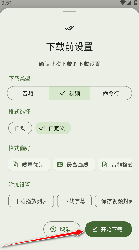 8.确认此次下载的下载设置,比如下载类型、格式选择、格式偏好、附加设置,然后点击开始下载。