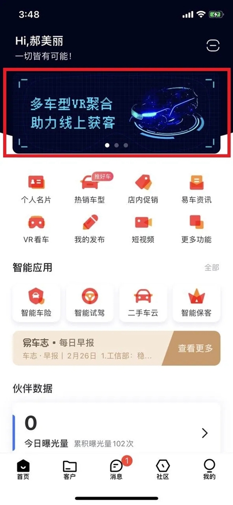 易车伙伴汽车销售的智能营销引擎,让客户资源独享、沟通无缝、业绩倍增!告别抢客烦恼与沟通低效,专注高效成交。易车旗下专业营销平台,基于30年汽车行业经验,打造覆盖全生命周期的移动连接服务,实现潜客精准获取、决策透明支持、跟进智能管理,助您从销售执行者蜕变为复合型营销专家。